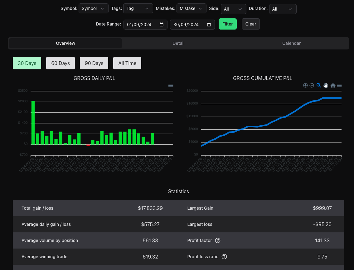 Multiple tools like Calendar, PnL by day by hour, month, duration, and many more...